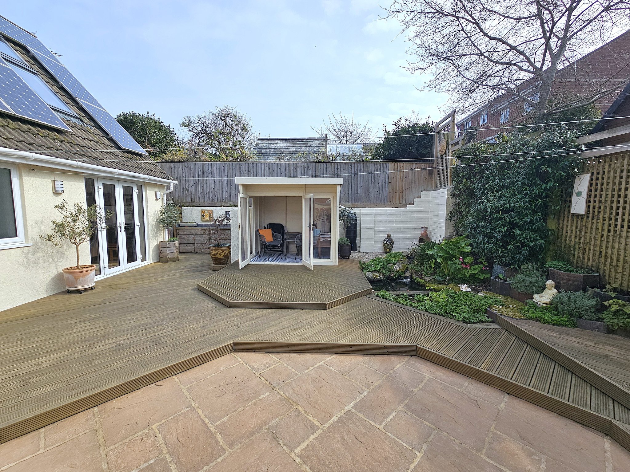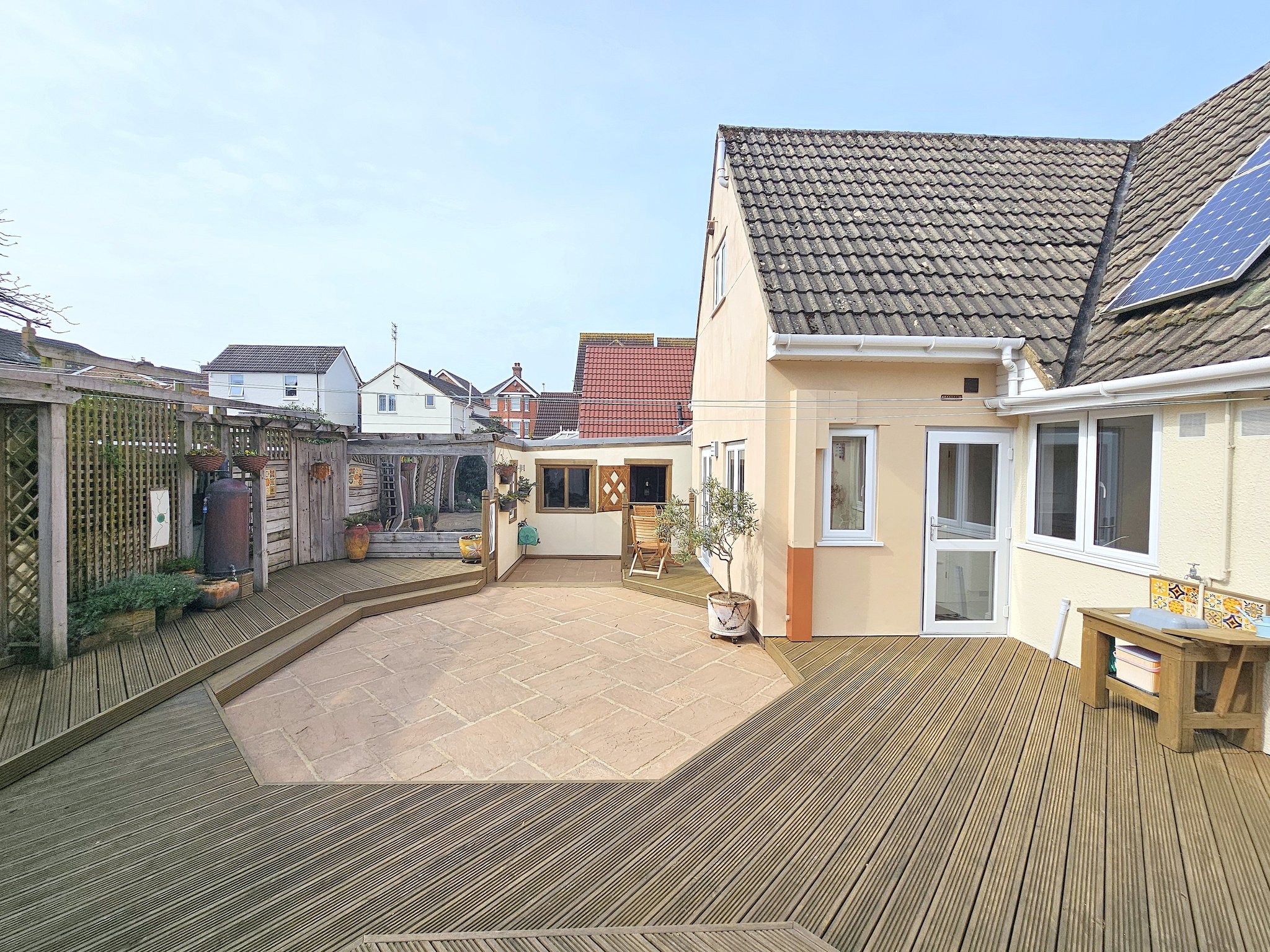 ** NO FORWARD CHAIN ** A beautifully presented three/four bedroom detached chalet conveniently situated on its own plot a short walk away from the popular Ashley Road with it’s array of shops, amenities and bus routes to both Poole and Bournemouth. This bright and sunny home offers circa 1500 sq ft of living space and viewing is imperative to not only appreciate not only its convenient location but also the versatile accommodation on offer, which comprises: DOWNSTAIRS; lounge/diner, sun room with own terrace, stylish kitchen, utility room, two double bedrooms/reception rooms and shower room. UPSTAIRS: Two double bedrooms and en-suite shower/bathroom room with power shower. Externally the property boasts a stunning South facing garden with numerous sun patios, fish pond and a summer house. To the front the carriage driveway provides excellent off road parking for around six cars which in turn gives side access to a detached garage/workshop. Further features of this ‘one of a kind home’ include: Engineered oak flooring, Multifuel burner, Worchester boiler (3 year guarantee remaining), integrated appliances to include Bosh dishwasher and extractor, Smeg cool touch self cleaning oven (guarantee until 2027), Beco washing machine, tall larder fridge, tall larder freezer, water filter system, Owned 16 solar panels on the South and West facing roovess, 4 solar powered electric blinds with wall mounted remote controls, gas central heating and UPVC double glazing. Nearby Schools – Livingstone Road Infants and Juniors, Heatherlands Primary, St Edwards RC/CoE Secondary and Poole High.